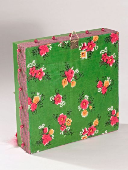 materials: MDF, ornamental paper, lace, pink marabou, roses, beads, gold ribbon and paint